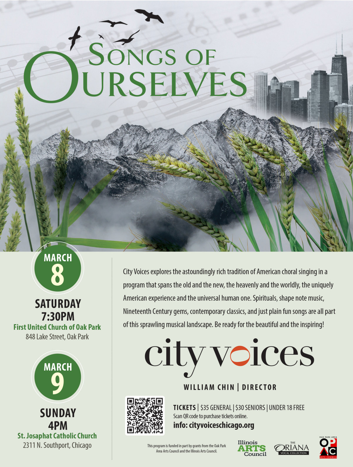 City Voices is one of the most versatile chamber choruses in the Chicago area. Founded in Oak Park in 2009, it has built a strong reputation as a welcoming group of experienced nonprofessional singers committed to high-quality performances. City Voices explores challenging, eclectic, and inspiring music from across the globe. The ensemble prepares a carefully curated repertoire each season and shares the beauty of that music in a series of public performances.